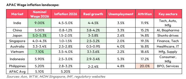 Nominal salary increase budgets across APAC are projected at around 5.2% for 2026, up slightly from 5.1% in 2025. This reflects strategic focus on talent retention in competitive sectors like tech, digital, and engineering.
