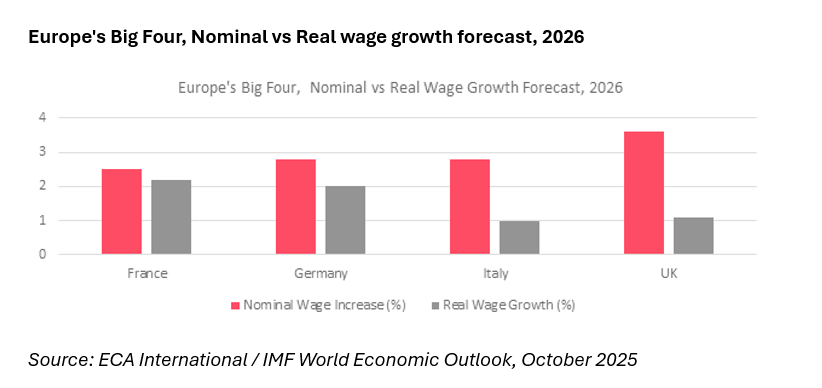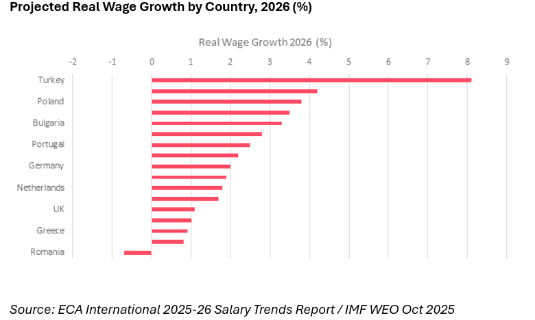 After years of inflation eroding purchasing power, European workers are finally seeing real wage growth return. The Employment Conditions Abroad (ECA) 2025-26 salary trends survey, covering 200 multinational companies across 25 European countries, confirms a broad-based recovery, real salaries rose in 23 of 25 surveyed countries in 2025, with a median real wage gain of 1.4%. looking ahead, ECA projects median real wage growth of 1.7% across Europe in 2026.