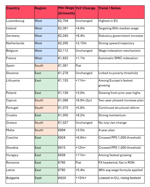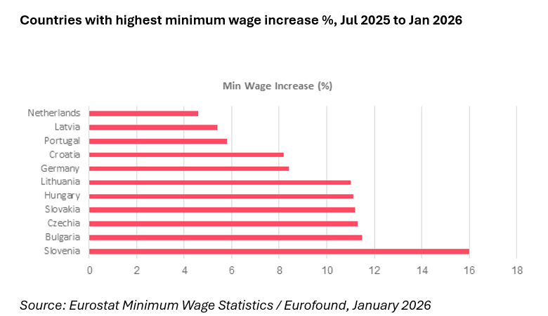 Bulgaria, Hungary, Lithuania, Slovakia, and Czechia recorded the most aggressive increases, all rising by more than 11% between July 2025 and January 2026. This reflects active application of the EU Minimum Wage Directive (2022/2041), which requires member states to target 60% of gross median wage. Slovenia saw the single largest percentage increase at 16%, driven by its poverty-threshold linkage formula.