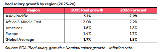 APAC continues to lead global real wage growth. In 2025, the region achieved a median real increase (above inflation) of 3.1%, far outpacing other regions like Europe at 1.4%. For 2026, real gains are expected to remain positive, though slightly moderated in some areas due to rising inflation in emerging markets.