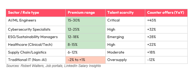 Wage pressure is acute in innovation-intensive sectors. AI/ML engineers command 15-30% premiums over baseline roles, with counter-offer activity up 45% year-over-year. Singapore’s tech sector reports 8-10% bilingual premiums for Japanese/Mandarin speakers. ESG and green energy roles see 12-18% premiums in Mainland China and Australia as decarbonisation mandates accelerate hiring.