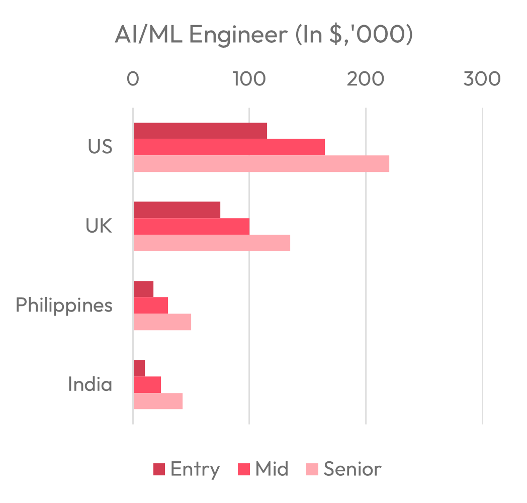 The demand for AI talent is outpacing the supply globally. Emerging economies such as the Philippines and Mexico exhibit the highest AI talent shortage. Interestingly, advanced economies like the United States, the United Kingdom, and Germany reflect more moderate shortage levels. However, this does not necessarily mean these markets are immune to AI hiring challenges.